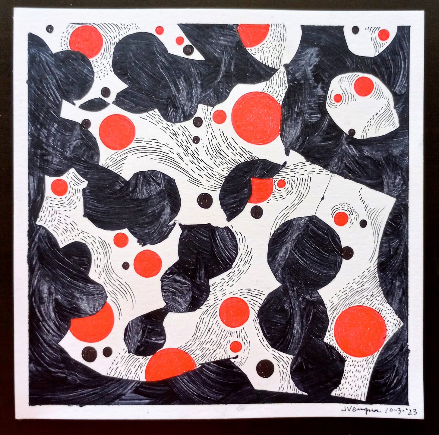 One of these days I’ll post a process video. For now, here’s a piece that was fun because I used cutouts of sticky shelf paper to mask areas to be drawn on with ink. The negative space was painted with acrylics.