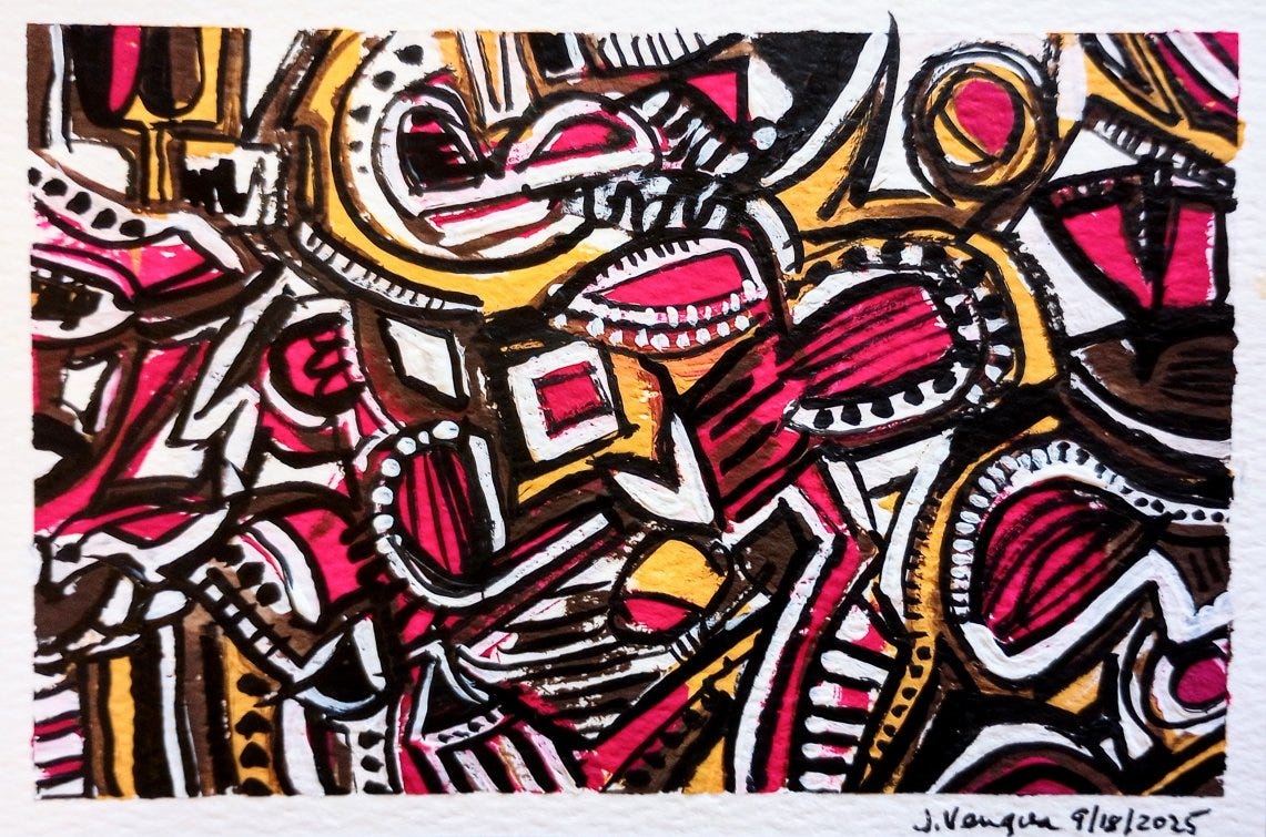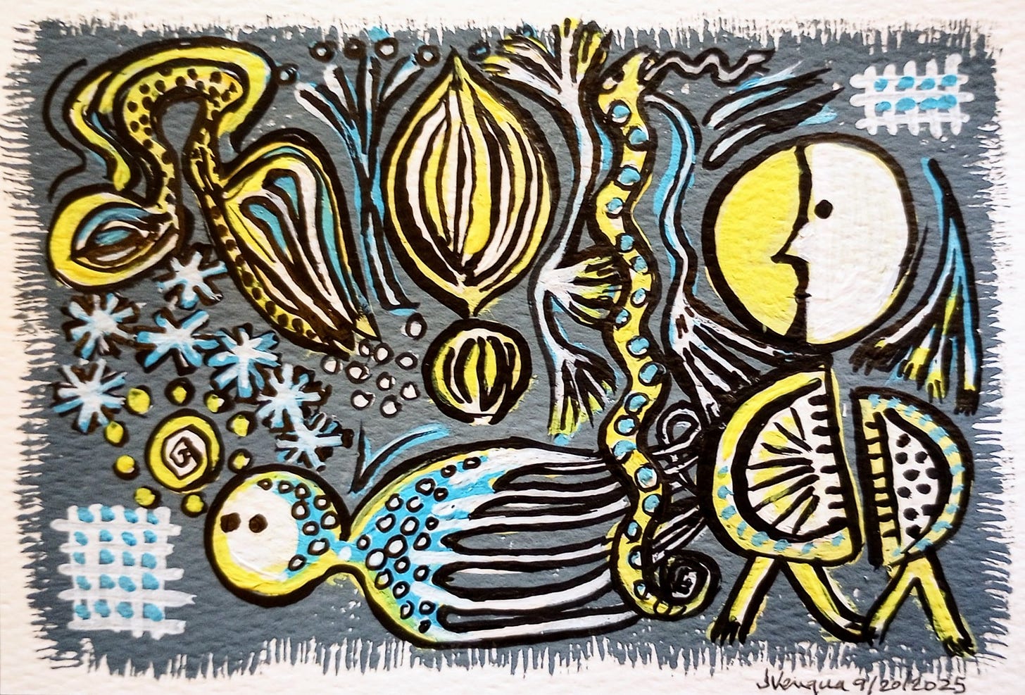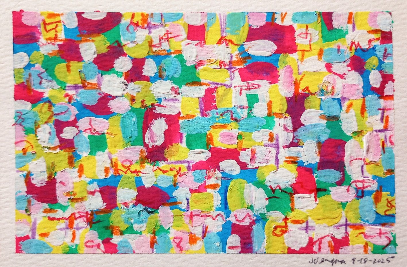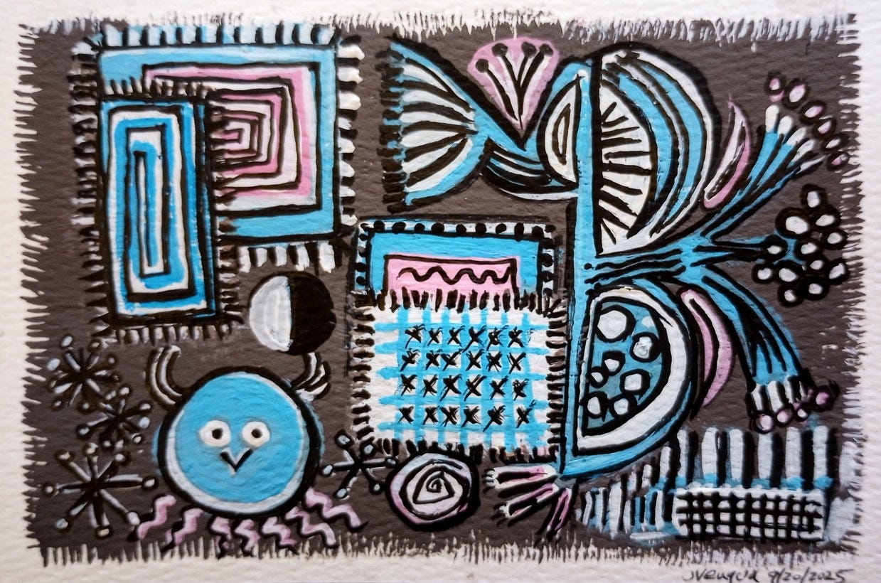 Here are my first four gouache experiments, which I painted on postcards for mail art. In the first example, I was dabbing the paint on the paper to check the consistency. It’s a bit like acrylics, but with a matte, opaque finish. However, the more water you add, the more transparent it gets—like watercolor. Then I took colored pencil and made a few asemic marks. After that, I tried using brush and ink over the gouache. It was nice to relax and have fun exploring this “new” medium :