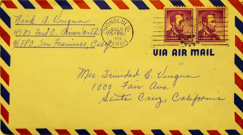 At this writing, I just got back from down town Honolulu to cable the money to you. I spent quite a bit of money for doing so, but it was worth it because I was in a hurry to get back aboard ship. You see I was on duty all day today and I was tired. Beside, I’ve not taken my shower, so I came right back. I hardly was an hour in town. I sent you one hundred seventy dollars only ($170.00) I am sure you’ll hear about it in the morning because I sent it [by] night letter.